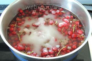 Кип’ятимо воду і занурюємо в неї чисту смородину, засипаємо цукром. Я не отчищаю ягідки від грона, використовую разом, так як потім все одно будемо віджимати. Закипятим, зменшимо вогонь і варимо близько 5 хвилин.