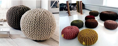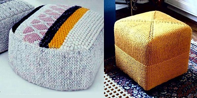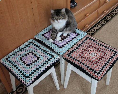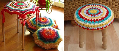 Обов’язково варто згадати про всілякі пуфики, табуреті, лавочки, які також забезпечують в’язаними чохольчиками або сидіннями. Як правило, вони дуже ошатні і виконані в позитивному настрої.