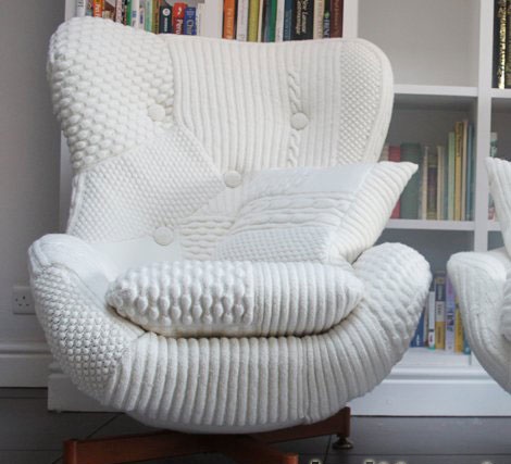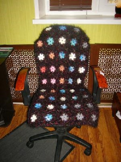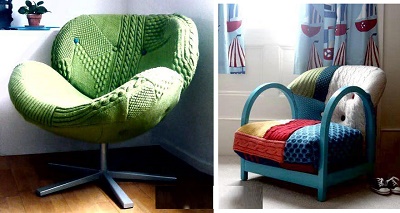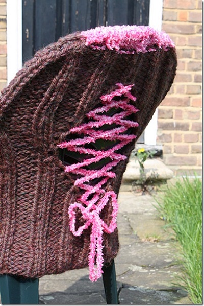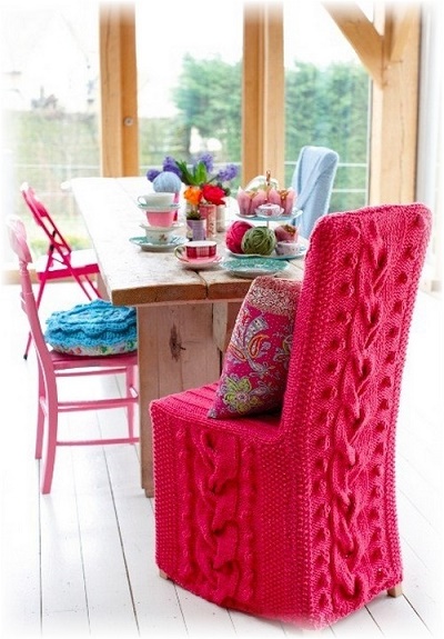 Дуже оригінально виглядають в’язані чохли на стільці. Під такою пов’язаної одягом навіть самий звичайний стілець перетворюється в крісло або трон. З допомогою чохлів для стільців можна уявити звичний інтер’єр в іншому образі, привести до одного стилю навіть різноманітні стільці.