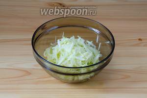 З кабачка знімаємо шкірку, а потім натираємо його на крупній тертці. Кабачок натертий добре віджимаємо, зайва волога не потрібна.
