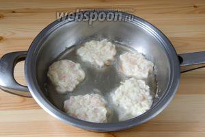 За допомогою столової ложки, викладаємо курячі оладки з кабачків на сковороду з розігрітим рослинним маслом і обсмажуємо по 3-4 хвилини з кожного боку.
