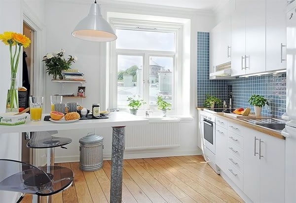 З усіх кольорів і відтінків, найбільш вигідним в оформленні маленької кухні, все-таки залишається білий. Саме цей колір стирає кордони і створює візуальну ілюзію розширеного простору.