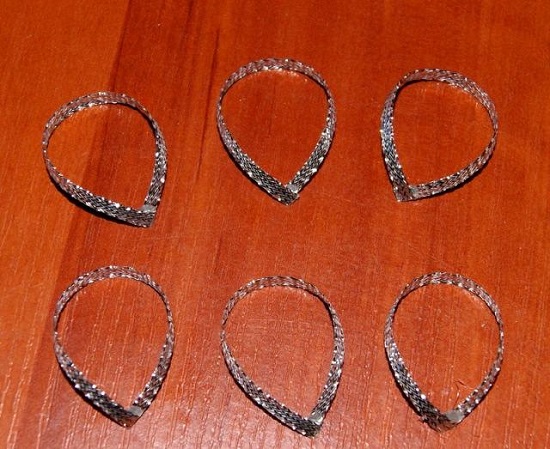 Тепер срібну стрічку нарізаємо на шість відрізків довжиною 8 см і теж робимо з них вушка.