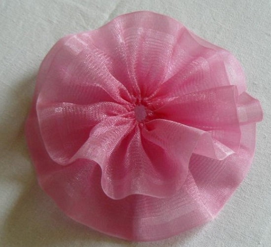 Тепер стрічку потрібно стягнути так, щоб вийшов квітка. Для цього її краю слід підігнути і пришити близько серединки.