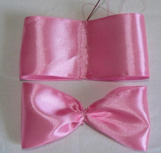Атласну стрічку потрібно скласти так, щоб її кінці прилягали до середини. Потім її потрібно прошити та стягнути, як показано на фото.