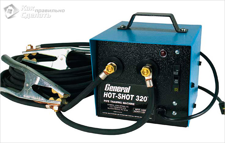 Для металевих каналізаційних труб можна застосувати спеціальний апарат для розморожування. Принцип його роботи досить простий. На краю труби, в якій утворився крижаний затор, кріпляться клеми. Потім на них подається електричний струм. В результаті труба нагрівається, і лід всередині неї тане. Але таке обладнання підходить тільки для металевих труб.