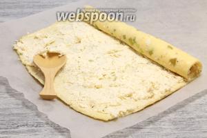 Промазуємо начинкою по всьому периметру — згортаємо, щільно притискаючи.