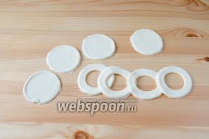 Робимо основу з листкового тіста. Листкове тісто розкочуємо тонко-тонко. Вирізаємо парна кількість гуртків, діаметром 3-4 див. У половини гуртків вирізаємо серединку.