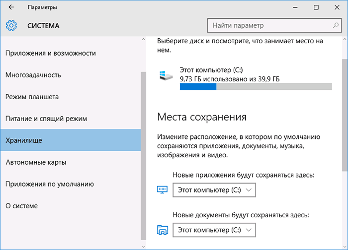 Додатки Windows 10 тепер можуть встановлюватися не на системний жорсткий диск або розділ диска, а на інший розділ або накопичувач. Для налаштування опції, зайдіть в настройки — система — сховище.