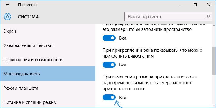 За замовчуванням ця опція включена, для її відключення, зайдіть в Настройки — Система — Багатозадачність і використовуйте перемикач «При зміні розміру прикріпленого вікна автоматично змінювати розмір суміжного прикріпленого вікна».