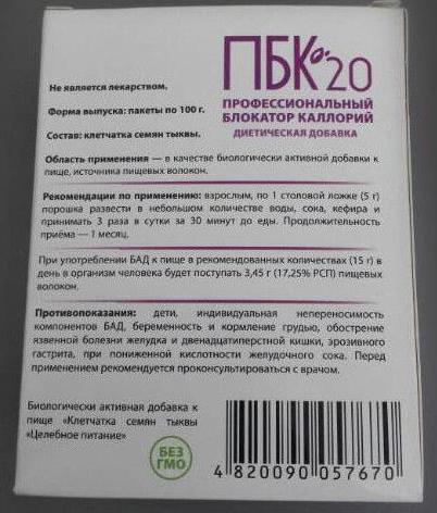 Отже, ви купуєте картонну коробку, на якій написано: блокатор калорій “ПБК-20”. Як приймати цей препарат, можна прочитати на листку-вкладиші. Упаковка містить 100 г порошку. Скільки там харчових волокон, поки залишається таємницею, на сайті інформації немає, можливо, вказано на самій упаковці.