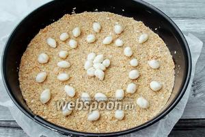 Дно форми (рознімної, 24 см) вистилаємо пекарської папером. Розподіляємо крихти печива, утрамбовуємо склянкою або рукою. Прибираємо в холод.