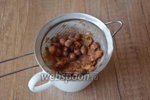 Далі настає самий трудомісткий процес перетирання ягід. Озброїтеся ситом з великої сіточкою і ложкою. Складаючи невеликі партії глоду в сито, перетираємо їх ложкою, інтенсивно видавлюючи м’якоть в дірочки. Щоб маса легше проходила крізь сіточку сита, підливайте трохи відвару з глоду. Все, що залишається на ситі після перетирання: кісточки, шкірка з ягід — необхідно викинути.