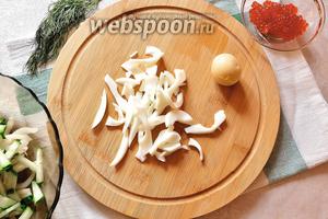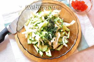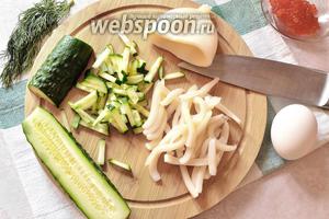 Огірок і кальмар нарізаємо соломкою.