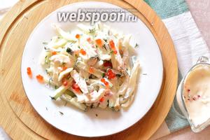 Салат розкласти по тарілках і заправити вершково-ікорної сумішшю перед подачею. Зверху ще трохи посипати червоною ікрою. Салат з кальмарів, з огірком, зеленню і вершково-ікорної заправкою, готовий.