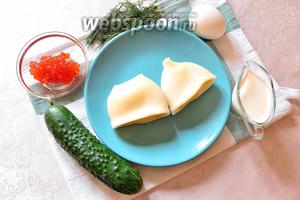 Для приготування салату нам знадобляться варена тушка кальмара, 1 яйце (теж попередньо відварити), 1 середнього розміру огірок, гілочка кропу, вершки і 2-3 чайні ложки червоної ікри.