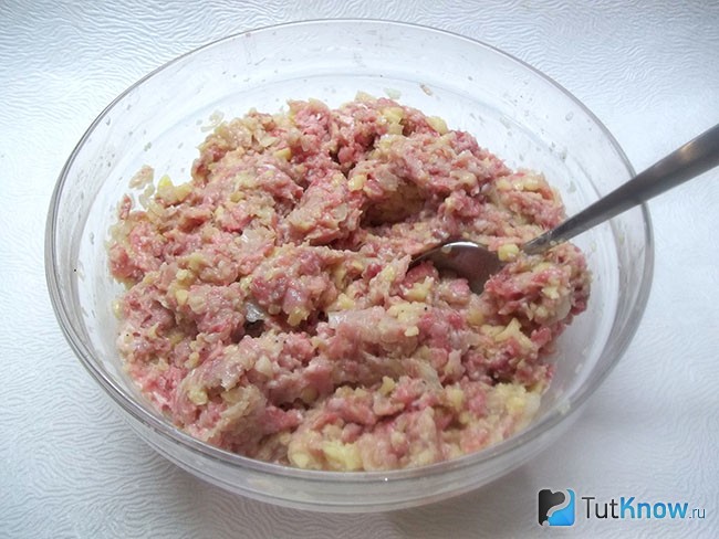 4. Добре перемішайте фарш. Потім його вибити. Робиться це наступним чином. Беріть двома руками фарш, піднімайте його з тарілки на висоту приблизно 30-50 см і кидайте назад. Виконайте цей процес близько 5 разів.