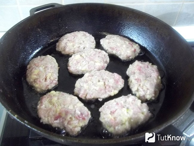 5. Сковороду поставте на плиту, налийте олію і добре розігрійте. Коли від сковороди буде виходити сильних жар, значить, вона готова для смаження котлет. Столовою ложкою беріть порцію фаршу з гіркою. Перекладайте його в руки і формуйте круглі або овальні котлетки, які викладайте смажитися в сковороду. Встановіть Температуру більше середнього.