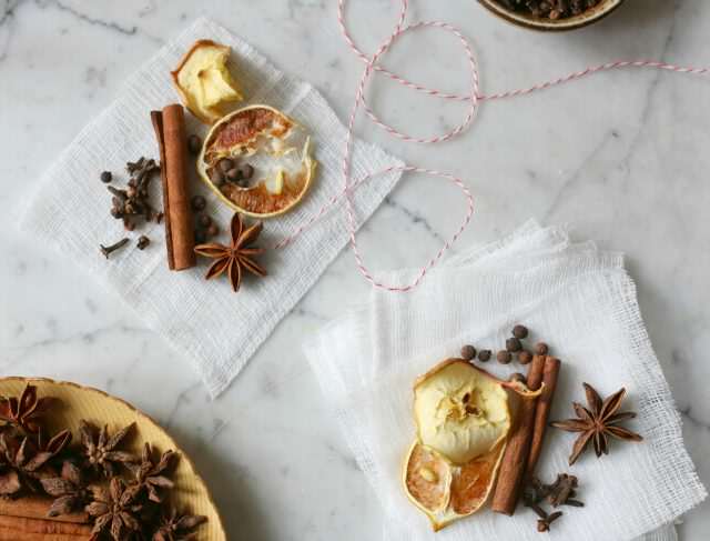 Сушені шматочки фруктів (яблуко і лимон) також готуємо самі, а не купуємо в магазині – і на відміну від глінтвейну, свіжі аналоги тут не підійдуть. Як сушити – почитайте статтю за посиланням вище або просто рівно розклавши кружечки фруктів на вощеному папері на деку, тримайте їх в духовці 3 години на малій температурі (близько 93 градусів) і обов’язково через перших 1,5 години переверніть часточки на іншу сторону.