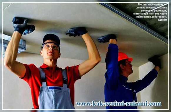 На відміну від стінового гіпсокартону на стелю монтується більш тонке полотно — товщиною 9,5 мм, а несучі профілі додатково закріплюються на стелі регульованими або нерегульованими підвісами.