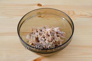 З консервованої горбуші зливаємо сік і розбираємо рибу на шматочки.