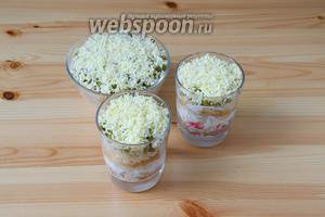 Збираємо наш салат. Я використовувала порціонну подачу в склянках і зробила ще одну порцію в невеликому салатнику. Дно склянок і салатника злегка змащуємо майонезом. Викладаємо спочатку крабове м’ясо, потім тертий білок. Змащуємо майонезом.