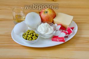 Вода 3 ст. л.Горошок консервований 0.5 банкуКрабове мясо 250 гЦибуля біла 1 шт.Майонез 150 гСир твердий 150 гОцет яблучний 2 ст. л.Яблуко 3 шт.Яйця курячі 4 шт.