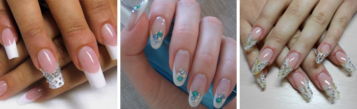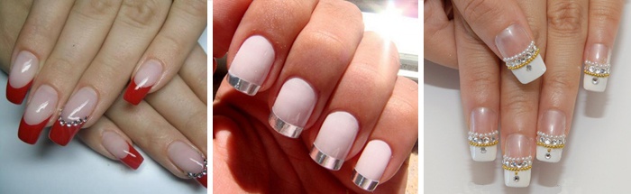 Сяючі стрази стануть чудовою прикрасою класичного, зворотного або місячного френч-манікюру. Використовуйте невелику кількість цих деталей, оформляють кілька нігтів, щоб нейл-арт виглядав вишукано і елегантно. Цікаво буде виглядати френч, прикрашений металевими вставками. Цей дизайн виник на хвилі популярності металік-лаків і передбачає різноманіття варіантів виконання.