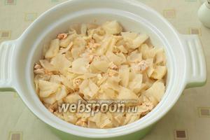 Каструлю для запікання змастити вершковим маслом і викласти в неї капусту з куркою.