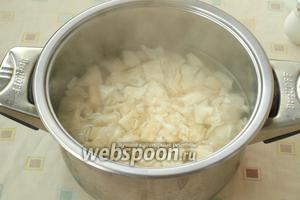 Скласти в каструлю капусту, залити окропом і знову, довівши до кипіння, проварити 5-7 хвилин в підсоленій воді. Потім помістити капусту на сито, щоб стекла зайва вода.