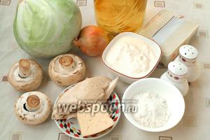 Для приготування страви нам знадобиться білокачанна капуста, цибуля, свіжі печериці, невеликий шматок філе готової курки, запеченої або вареної, твердий сир, сметана, соняшникова та вершкове масло, сіль і перець.