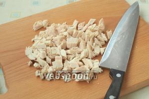 Шматочками нарізати готову курку.