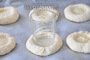 Після расстойки, посередині булочок, денцем маленького стаканчика зробити поглиблення.