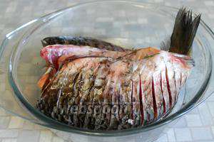 Карасів у мене було багато, тому я їх всіх почистила, випатрала і «згорнула» їм голови — це простіше, ніж выколупывать зябра, так і на сковороді зайве місце не займається. Так мене навчила давно робити сусідка, у якої чоловік був завзятий рибалка. Нанести поперечні насічки по спинці гострим ножем.