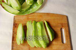 Чайот помиємо, потім разрежем на 2 частини видалимо насіння, далі ріжемо великою соломкою. Приблизно 1 огірок на 8-10 частин.