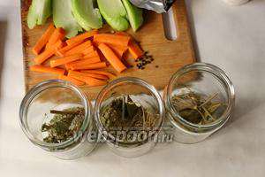Морква ріжемо звичайної соломкою. В чисті банки кладемо листя хрону і кропу, додаємо по лавровому листу. У мене банки по 0,7 л.