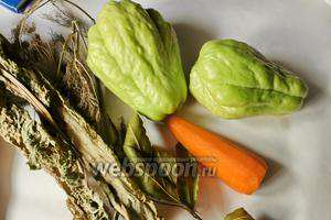 Для приготування візьмемо чайот, моркву, листя хрону і кропу (у мене сушений, але краще свіжий), чорний перець горошком, лавровий лист. А також воду, сіль, цукор, оцет.