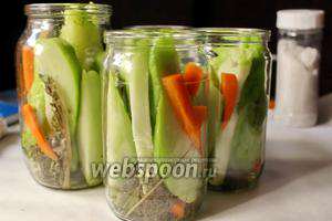 Заповнюємо банки чайотом і морквою. Кладемо чорний перець (по 2-3 штуки на банку).