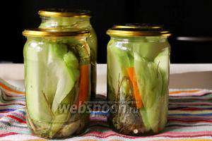 Банки перевертаємо, вкриваємо рушником і залишаємо на ніч. Через 2-3 дні огірки чайот будуть повністю готові до вживання. Зберігаємо маринований чайот у погребі або в прохолодному місці.