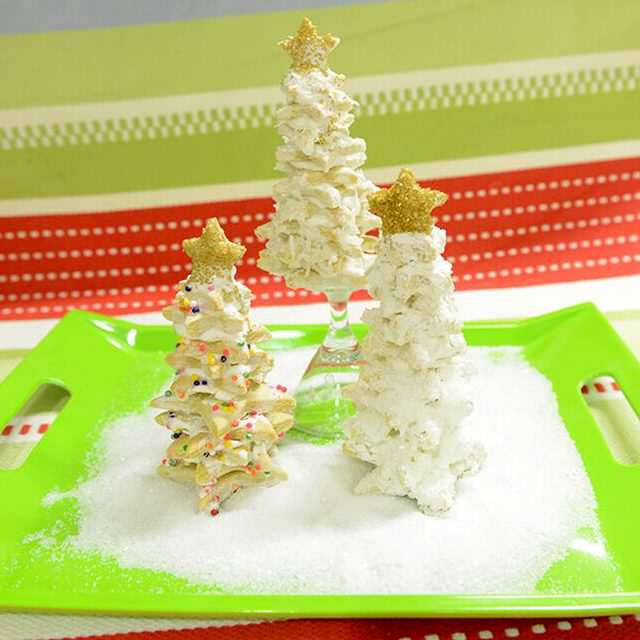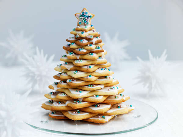 Знову випікаємо звичайне ваше улюблене печиво, роблячи його у вигляді зірок. Однакового розміру або поступово зменшується (але тоді починайте з ДУЖЕ великої зірки). Потім збираємо ці печива в стопку у вигляді ялинки, склеюючи їх білою глазур’ю-«снігом». Зверху на ялинку поставте вертикально найменшу зірочку, після глазурі без кісток у їстівних блискітках або іншою яскравою дуже дрібної обсипання. Також кожну ялинку можна «окропити», поки глазур ще не застигла, кольоровий обвалуванням, що нагадує ялинкові іграшки або запалені гірлянди здалеку.