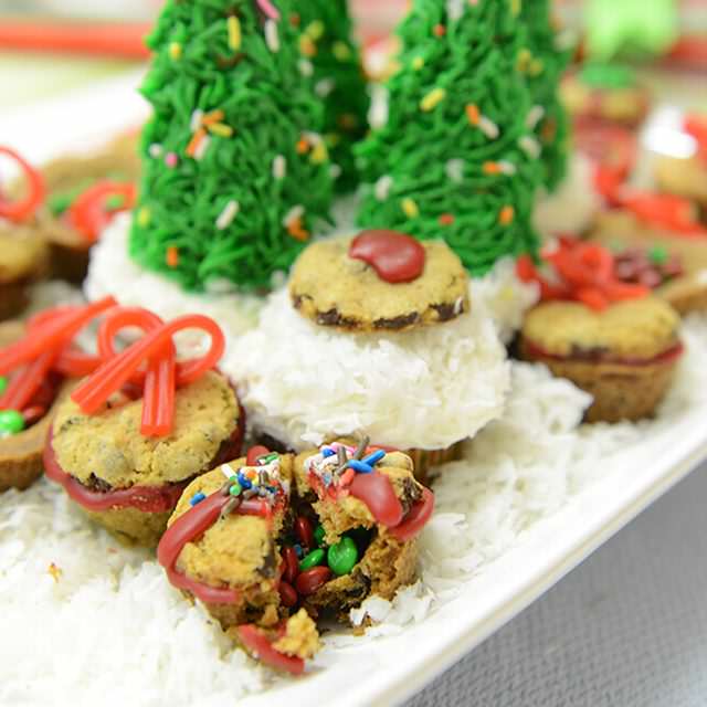 Хто ж не любить приємні сюрпризи?! Готуємо звичайне своє улюблене тісто для печива, скачуємо його в окремі кульки, потім розкачуємо кульки по черзі в тонкі «млинці». Половину кожного млинчика кожен раз кладемо у форму для кексів (силіконову або будь-яку жорстку), притискаючи до країв форми для одержання рівної гладкої чашечки з тіста. Другу половину кожного млинчика знову скачуємо і заново розгортаємо в звичайне кругле печиво діаметру, рівного діаметру ваших майбутніх «чашок» зверху. У такому вигляді відправляємо все в заздалегідь прогріту до 180 градусів духовку на 10-12 хв. Тісто при цьому підніметься, так що занадто багато його в кожну формочку не закладайте. Чашечки і кришечки готові – виймайте, чекайте, поки охолонуть, потім заповнюйте перші улюбленим шоколадним драже на глазурі. Зверху кладіть «кришечки», приклеюючи їх розплавленої глазур’ю, наприклад (або шоколадом або чимось ще підходящим). При цьому кришечки зверху завжди можна заздалегідь декорувати в тематиці свята.