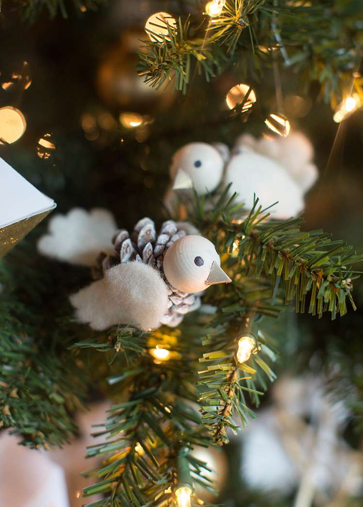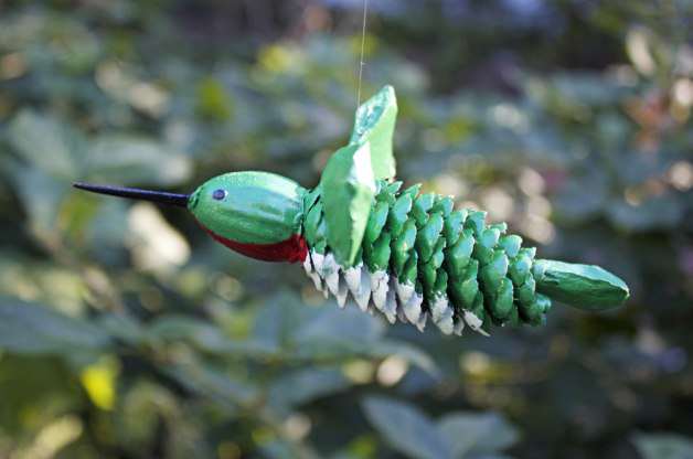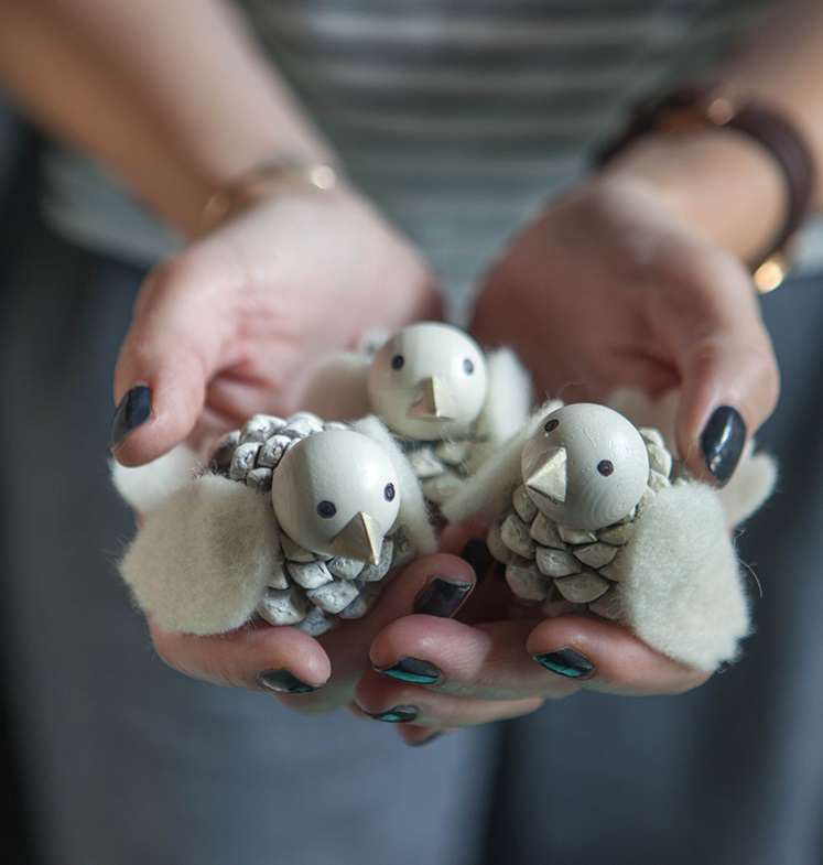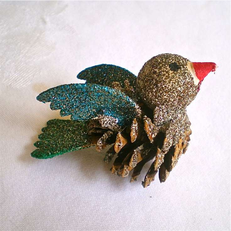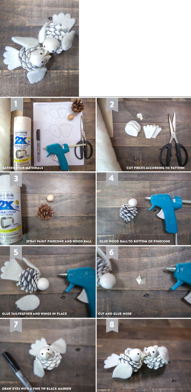 1) Шишки фарбуємо блідо-бежевою/блідо-сірою фарбою або відбілюємо. Також фарбуємо дерев’яні кульки. На висохлих кульках малюємо точками очі, знову сушимо. А поки приглушено-золотий щільного паперу або тонкого картону робимо пірамідки – дзьоби. Голови висохли – наклеюємо дзьоби на належне місце. Видаляємо у шишок зверху кілька лусочок, вклеюємо пташині голови в утворилося поглиблення, орієнтуючись на те, що шишки висіти і стояти у вас потім не вертикально, а горизонтально. З фетру або іншого щільного матеріалу відповідного кольору вирізаємо крила і хвости, наклеюємо на шишки.