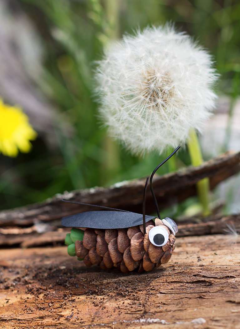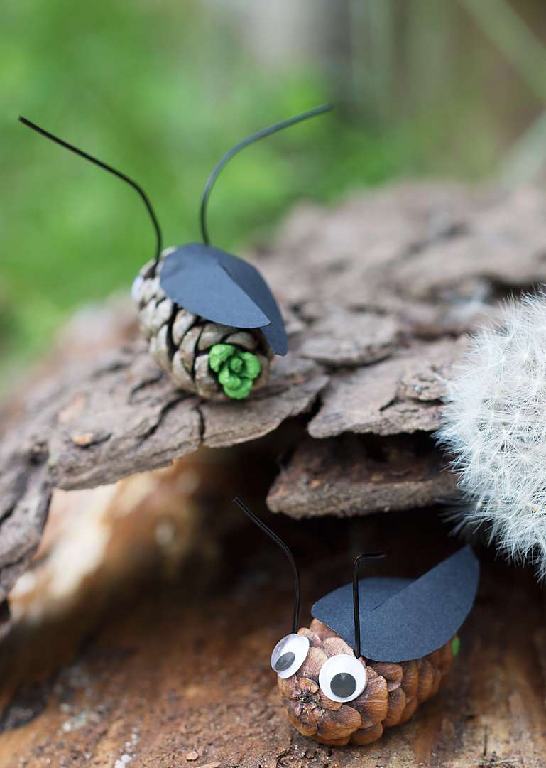 Тут зеленим фарбуємо лише кілька самих верхніх лусочок шишки. Вусики жуків – дріт у чорній оплітці. Крила – щільна чорна текстурована папір.