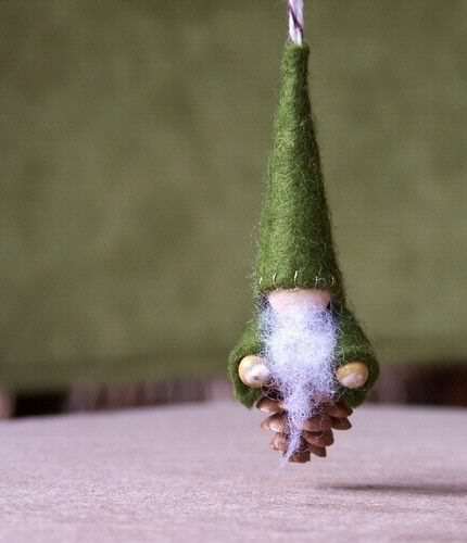 Зверніть увагу, що особливу чарівність ось цього ельфу/гномові надають стібки, що йдуть по нижній кромці шапочки. Ручки ельфів тут і на знімку вище – дерев’яні намистинки на шнурі, зав’язаному після кожної намистини у вузлик. Кінчики шнура обрізаємо близько до узелкам, а зверху на вузли для надійності капаємо пару крапель прозорого гарячого клею.