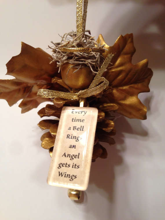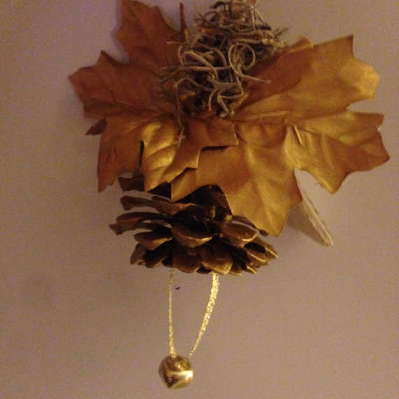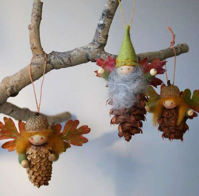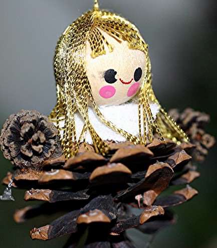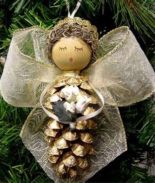 У другому варіанті голова – жолудь, крила – мініатюрні кленові листки. Разом з шишкою все пофарбовано золотою фарбою. Волосся – штучний мох.