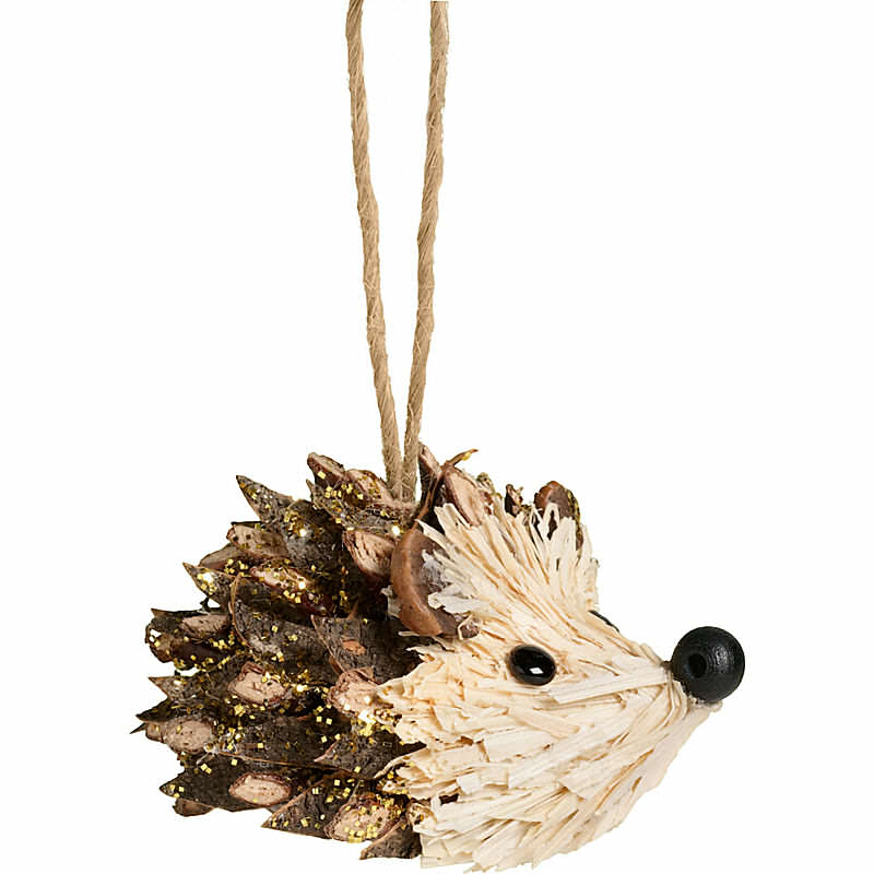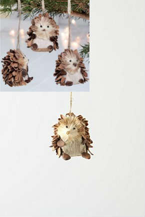 У першому випадку кусачками відокремлюємо лусочки у шишки з одного боку, щоб в горизонтальному положенні низ шишки здавався плоским. Фарбуємо в шаховому порядку лусочки шишки світло-бежевий і коричневий кольори (або тільки бежевий, а інші просто залишаємо, як є). І поки фарба ще не висохла, посипаємо шишку блискітками. Попка шишки тут – передня сторона їжачка. Робимо основу для загостреною мордочки з фетру – невеликий конус і відразу приклеюємо його до просохлій шишці. А далі починаємо наклеювати по колу на фетр і шишку спереду смужки рафії, одночасно формуючи кирпатий носик у їжака. Десь на середині роботи вклеюємо великі лусочки шишки в якості вушок. Ну а далі вам залишиться тільки наклеїти намистинки.