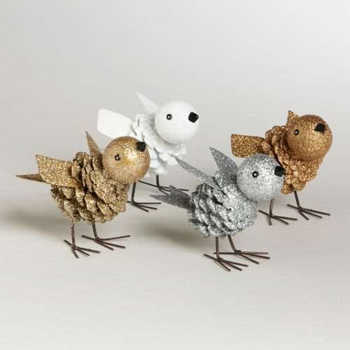2) Ці малюки робляться практично також, тільки крила і хвости вирізаються з тонкого картону, а картонні деталі, шишки і дерев’яні (або, скажімо пінопластові) кульки повністю обприскуються непрозорою спрей-фарбою з блискітками. У кілька шарів по необхідності. Ніжки з дроту скручуються в коричневій оплітці.