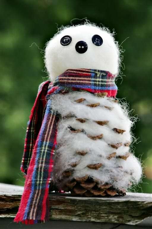 Голова – кулька вовни, виконаний в техніці валяння. Також вовна намотана на саму шишку. Плюс шарфик з картатої тканини, все фіксуємо гарячим клеєм.