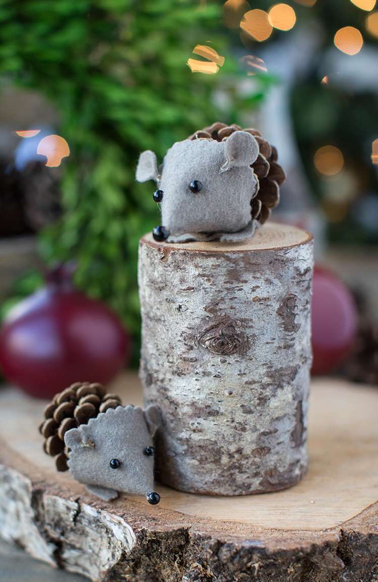 1) Теж дуже проста дрібничка. З сірого фетру нарізаються кілька півкіл з одним рифленим краєм (найлегше такий край зробити за допомогою фігурних ножиць – у вільному продажу в Рунеті за 150-350 р.), з цих напівкіл зшиваються/склеюються конуси: це голови майбутніх їжачків. На кінчик і з боків зверху кожного конуса пришиваються чорні намистинки – ніс і очі. З фетру малим півколом вирізаються вушка, і кожен півколо знизу складається і зшивається приблизно до третини висоти вуха. Потім вушка пришиваються до конусам зверху ззаду. Залишилося тільки приклеїти по одній готової ежиной голові одній шишці. Знизу до шишкам приклеюються лапки, ззаду можна додати хвостики з того ж фетру.