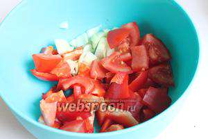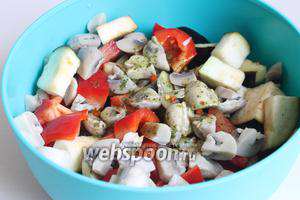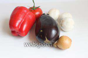 Отже, такі продукти візьмемо: паприка червона, цибуля, печериці, баклажан, помідор, спеції.